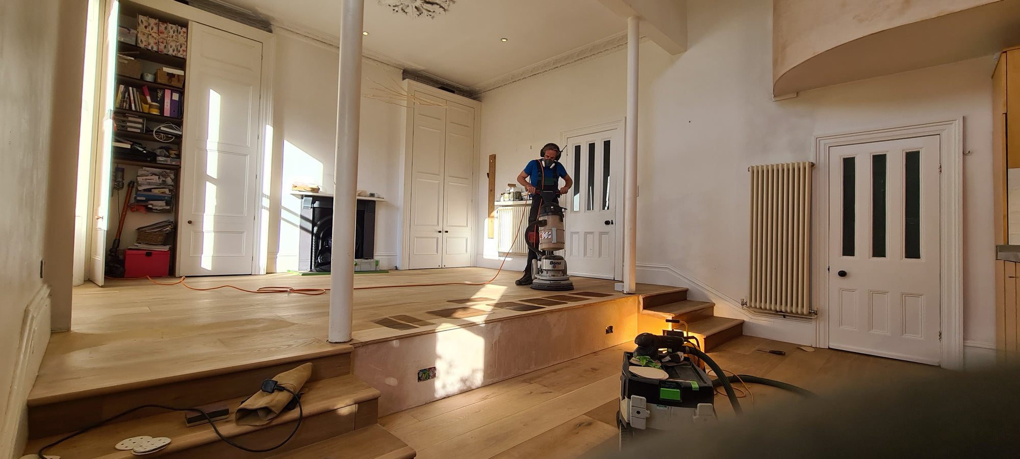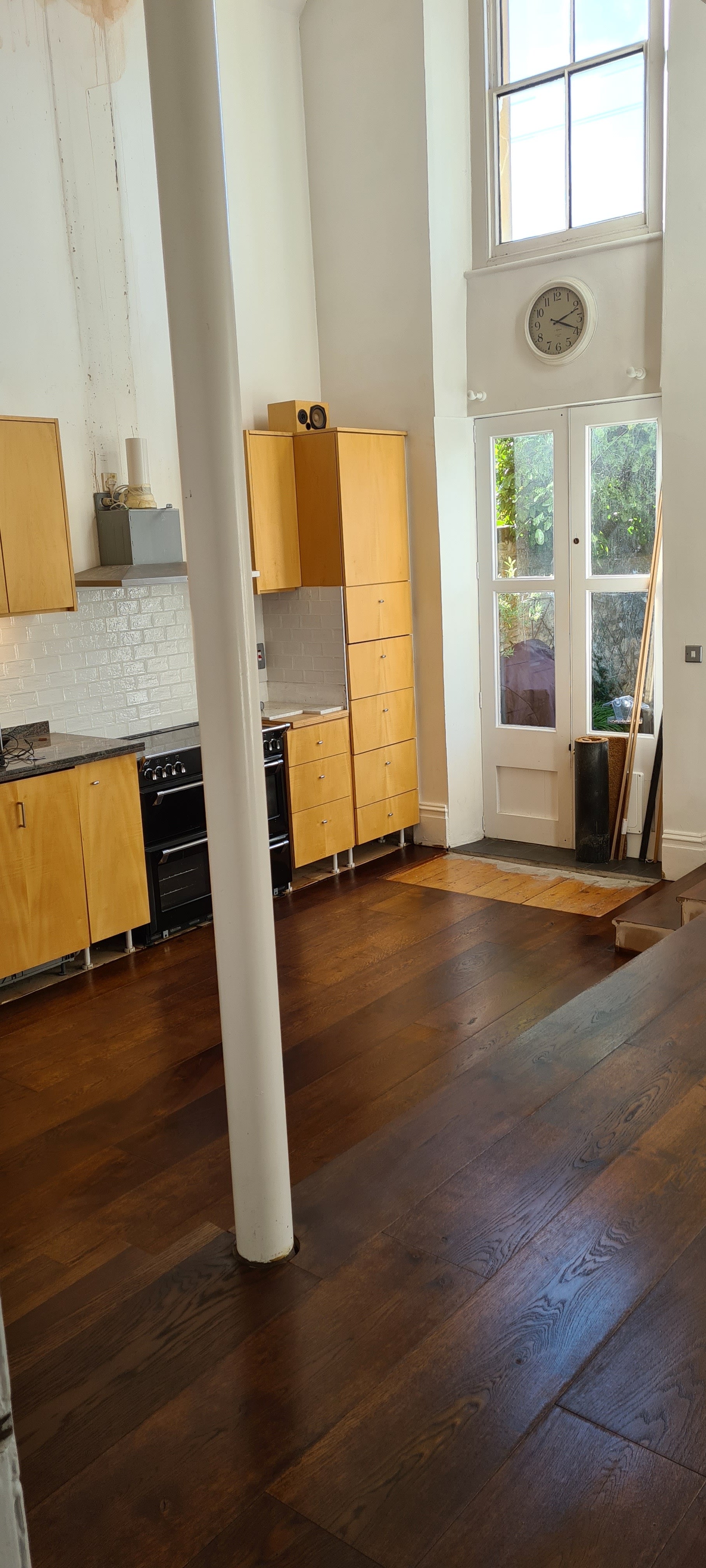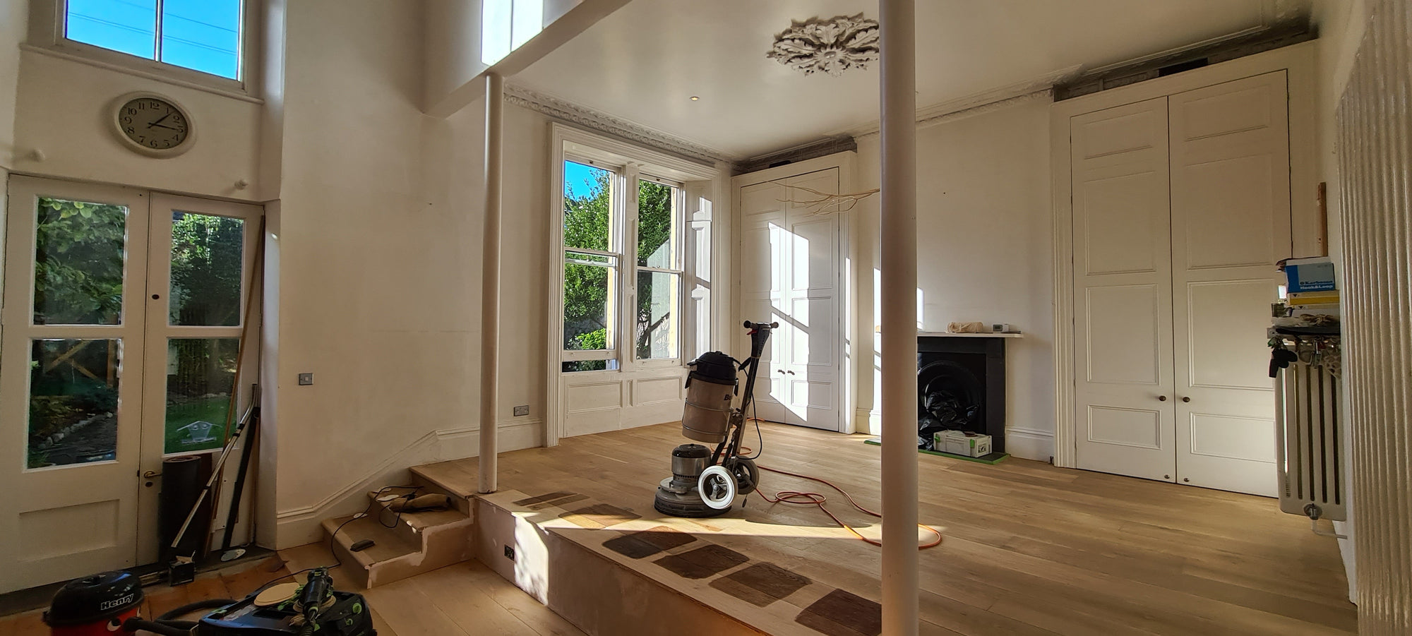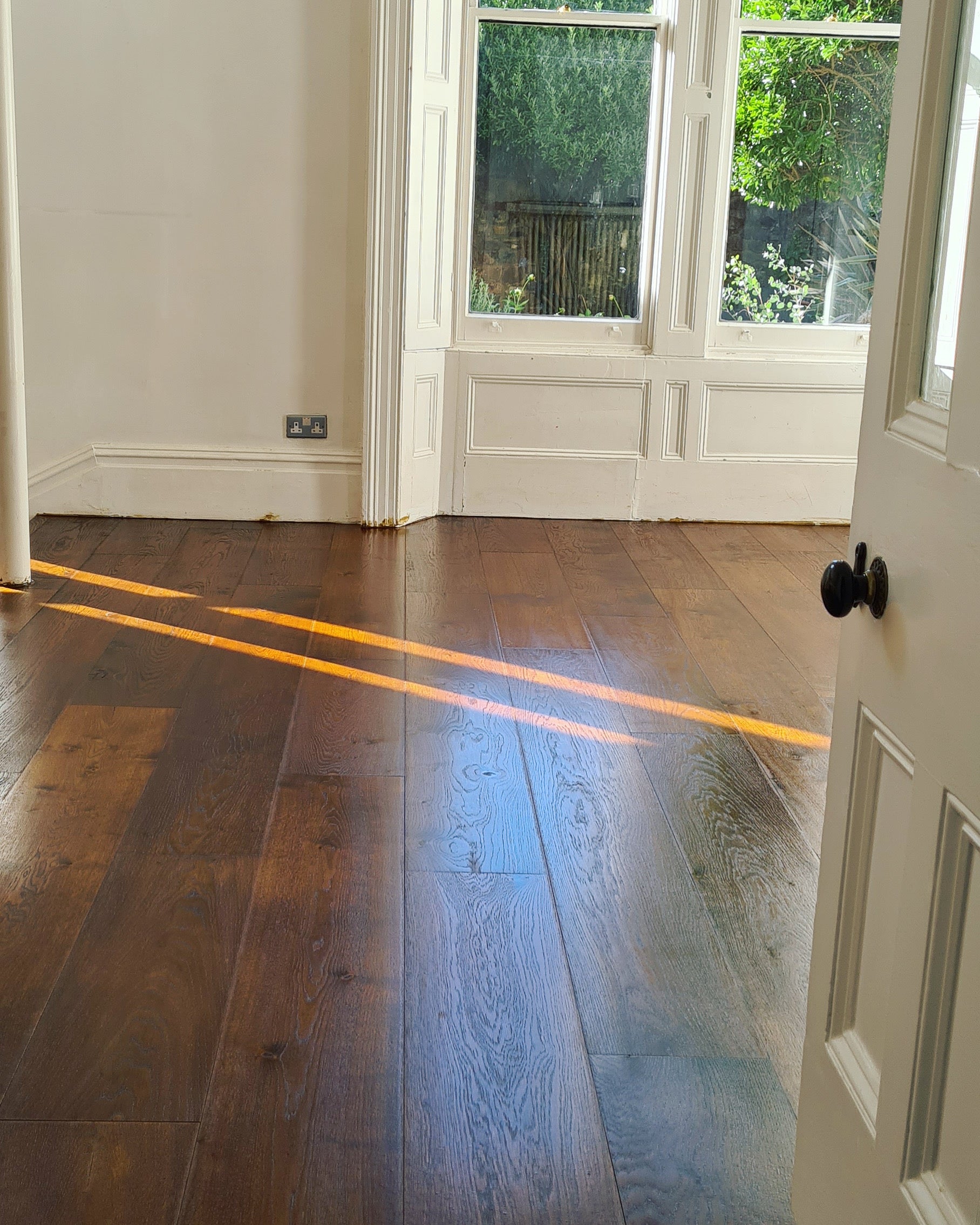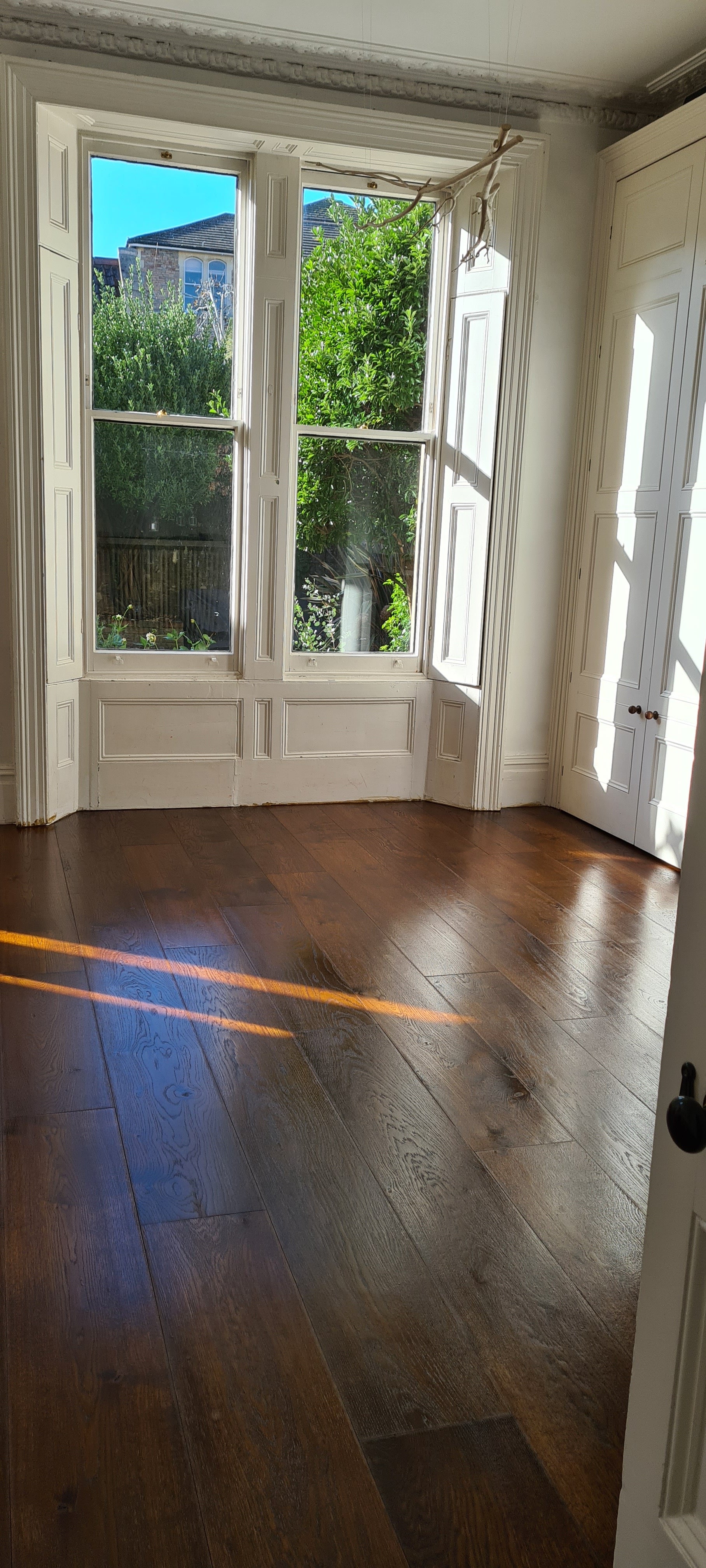 We carried out a complete hardwood floor restoration, sanding the boards back to raw oak and repairing minor imperfections for a flawless base.