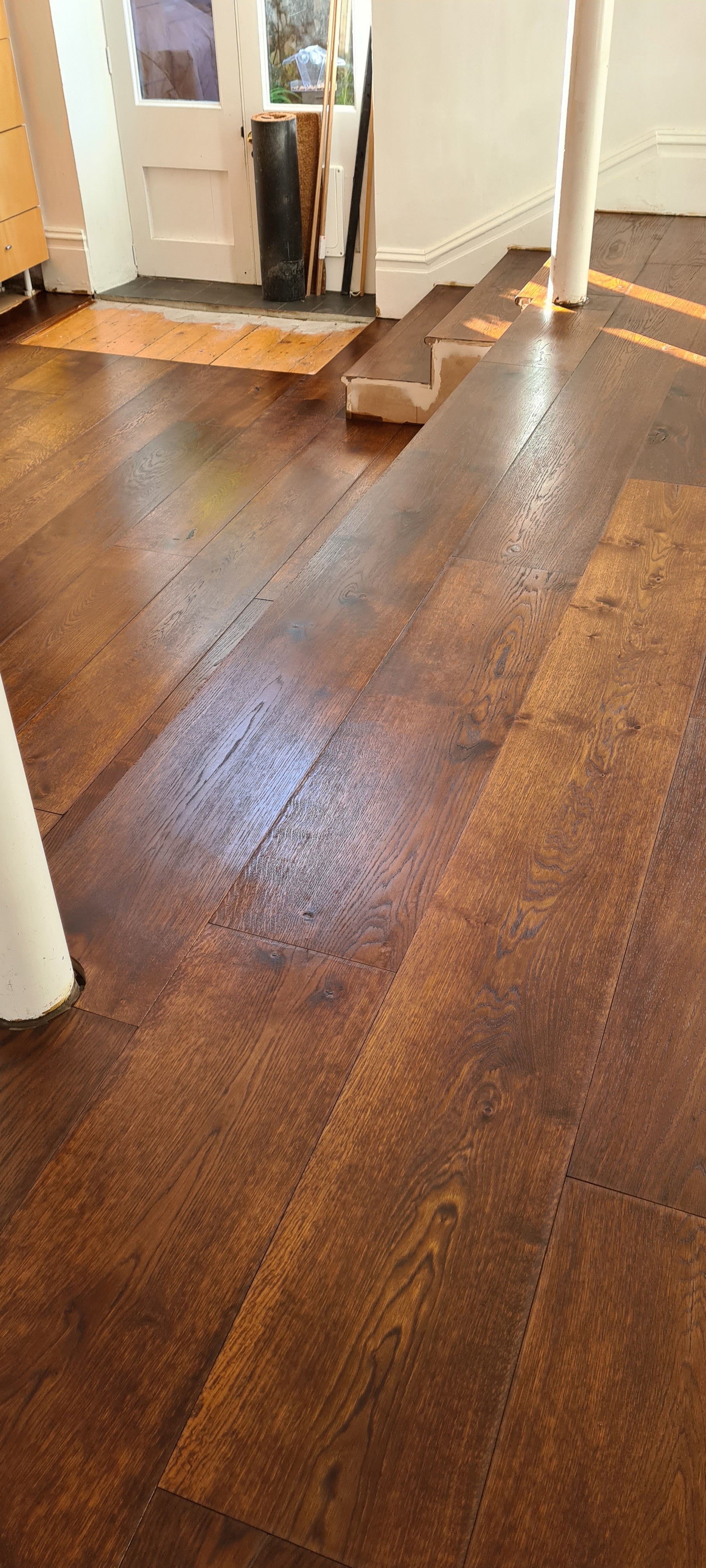 Several Morrells alcohol-based stain samples were tested on the freshly sanded floor, allowing Simone to choose her ideal tone. The selected colour was carefully applied by hand, ensuring maximum precision and depth of finish, enhancing the natural grain and warmth of the oak.