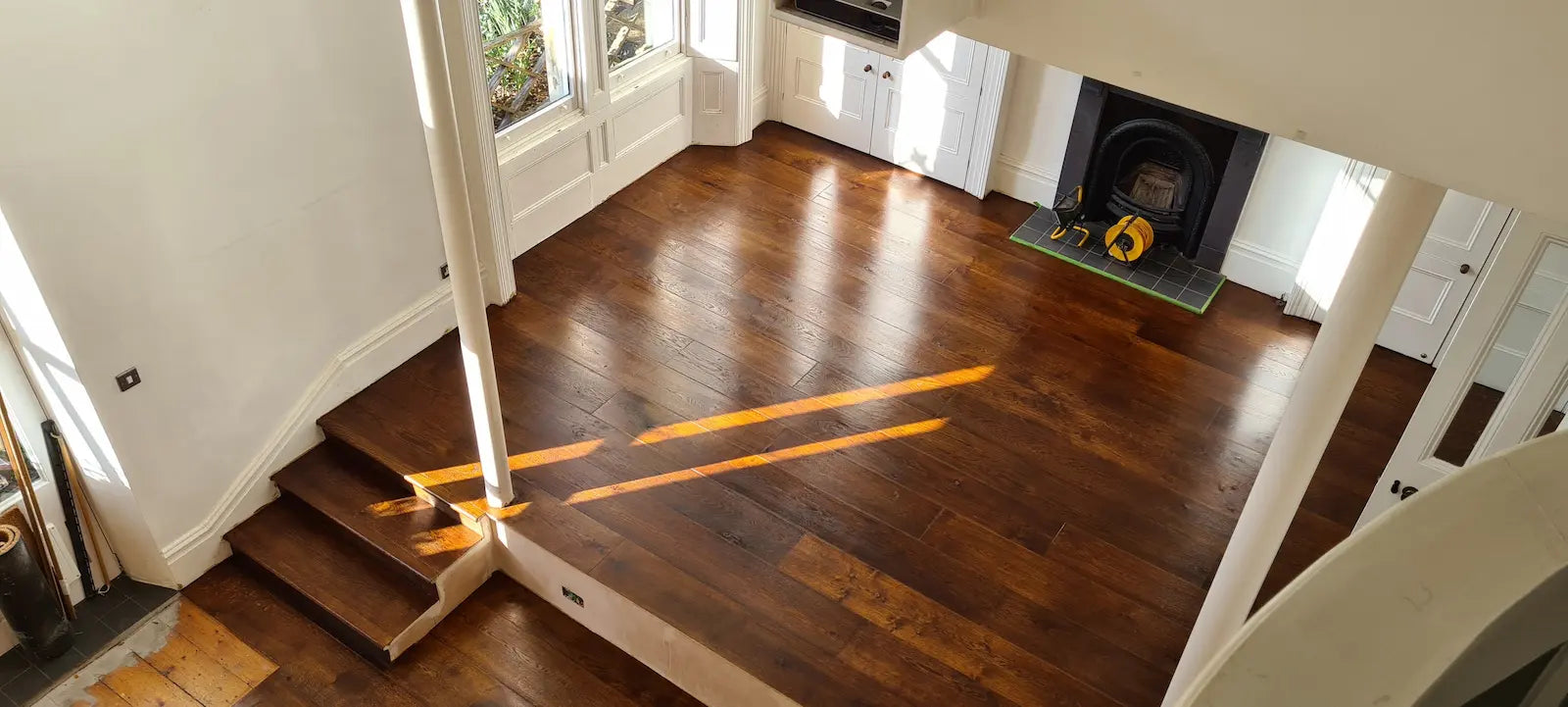 Unfinished wood flooring is installed, then sanded and stained if required, and sealed on-site, offering complete customisation of colour and finish, tailored to your space.